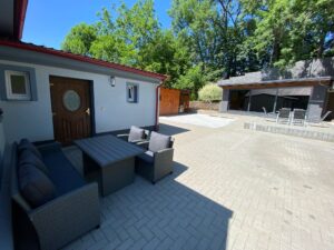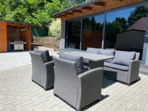 Zahrada s grilem: K dispozici máte venkovní posezení, kde si můžete připravit večeři na grilu a užít si klidný večer na čerstvém vzduchu.
