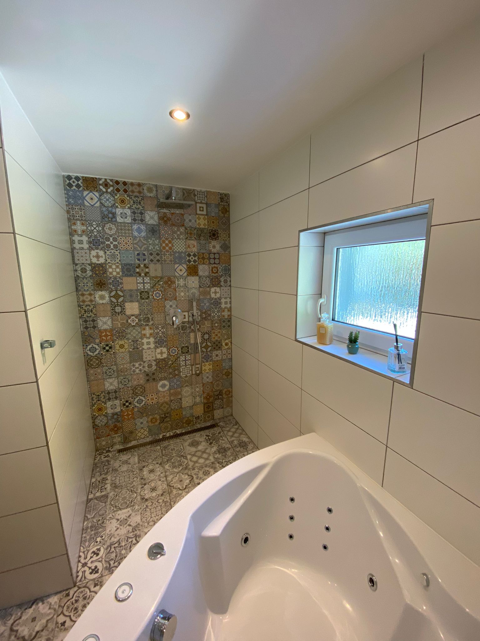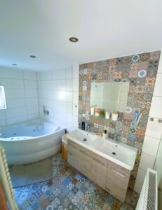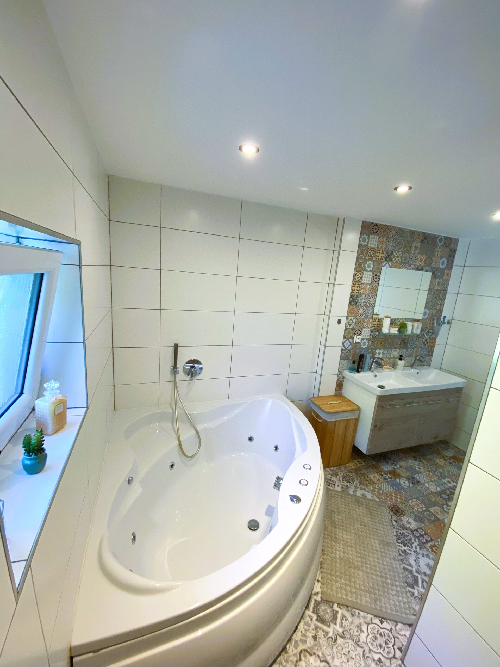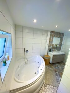 Koupelna s vířivou vanou: Dopřejte si horkou koupel a uvolnění přímo v soukromí svého apartmánu.